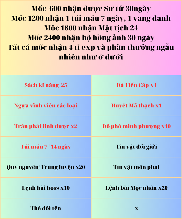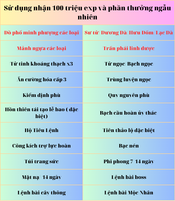 Thông qua việc mở bảo rương hồng ngọc(20v/1) và ngọc bích bảo rương (10x/1) sẽ nhận được rất nhiều phần thưởng phong phú và hấp dẫn