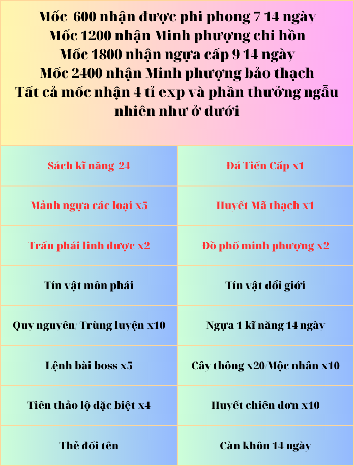 Khi sử dụng 600, 1200, 1800 và 2400 hoa hồng đặt biệt sẽ nhận được cả phần thưởng ngẫu nhiên và phần thưởng cố định.