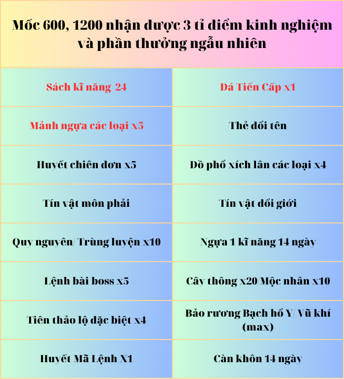 Trong thời gian diễn ra sự kiện có thể sử dụng 1200 cái Kẹo bông gòn ( mua 10v/1), và 1200 kẹo lồ lô đường( mua 5x/1) Tại NPC Tổng Quản Sự Kiện.
