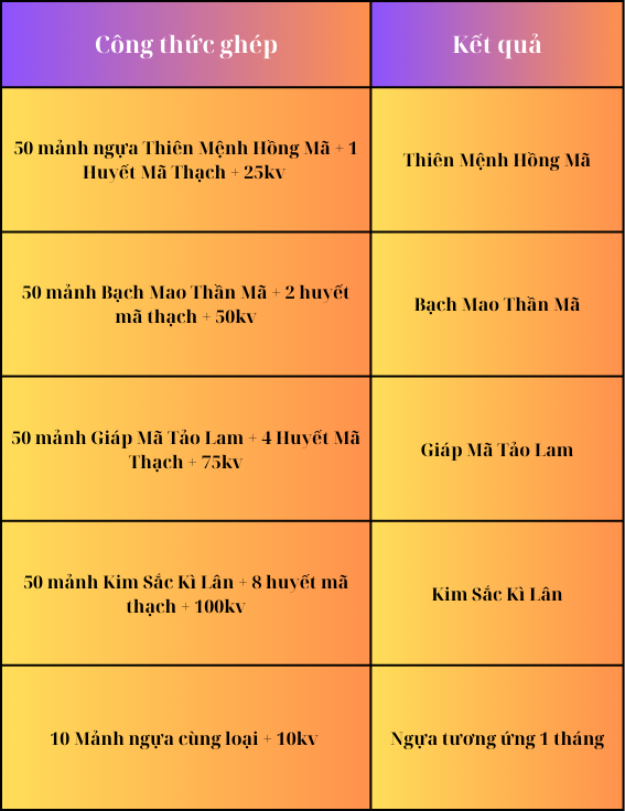 Mảnh ngựa các loại : Có được khi tham gia sự kiện, hoạt động của server, săn bos, event....