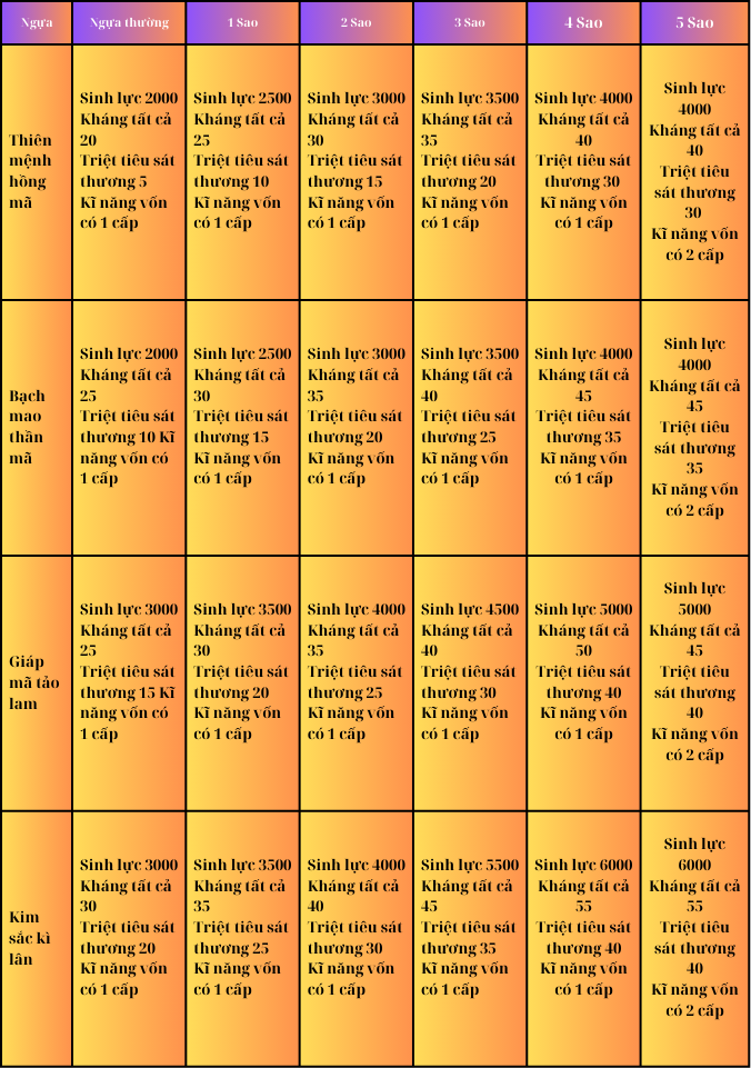 Những con ngựa cực kì quý hiếm tưởng chừng chỉ có thời hạn thì nay quý đồng đạo đã có thể sở hữu nó, đồng thời gia tăng sức mạnh vô địch khi nâng cấp ngựa.