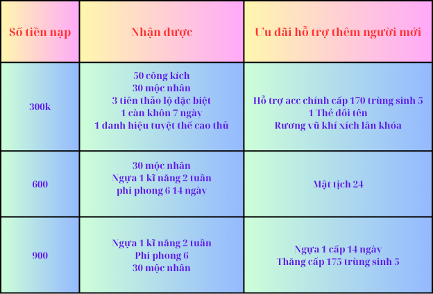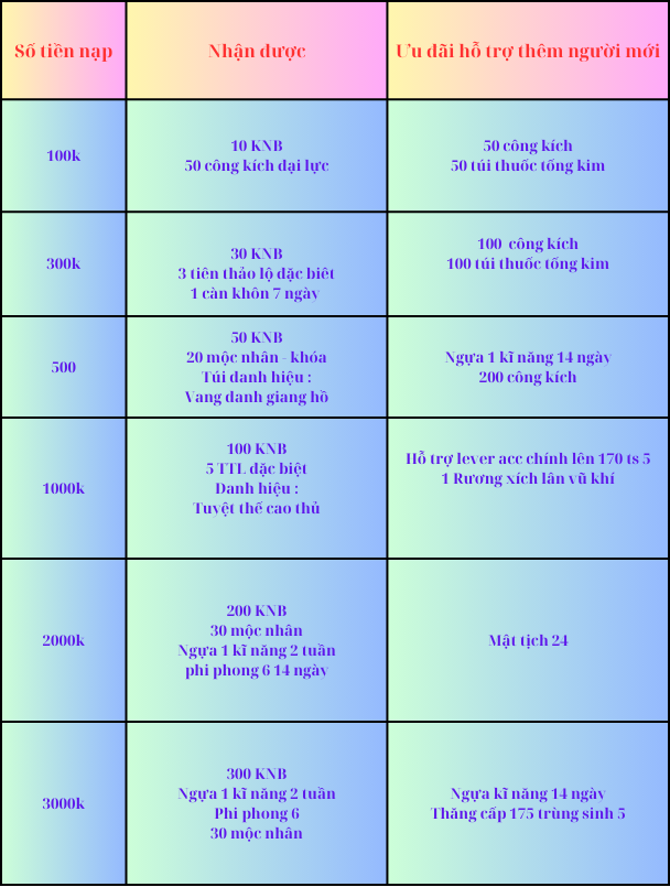 Nhằm tìm lại anh em cũ cũng như hỗ trợ hơn cho người mới được tiếp cận game dễ hơn thì bên mình hỗ trợ phúc lợi tháng 9 với 99% trong server. Đồng thời anh em cũ trong server đã nghỉ muốn quay lại game bên mình sẽ hỗ trợ mốc nạp tương đương số tiền cũ anh em đã nạp ( Tối đa mốc 900k). Rất hi vọng sự hỗ trợ này cũng như là lời tri ân và cám ơn đến với các huynh đệ đã và vẫn gắng bó với tình võ lâm trong hơn 1 năm nay.