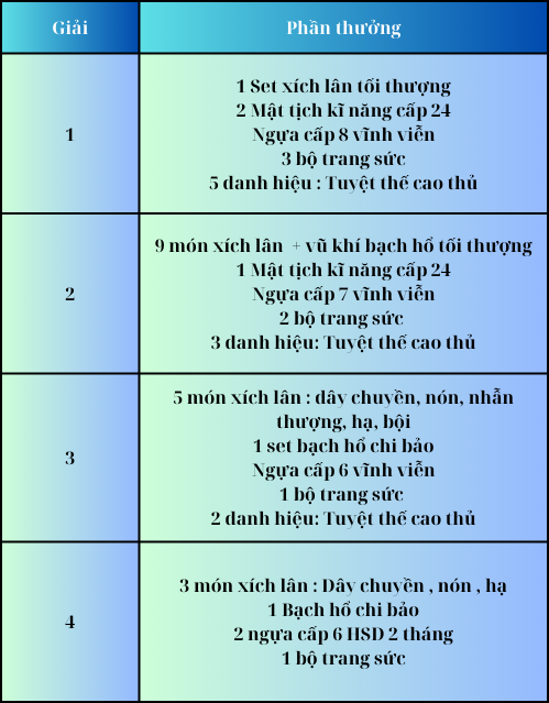 Phần thưởng cho các bang hội tham gia Thiên hạ đệ nhất bang lần này. Nếu có thêm bang hội đăng kí sẽ tăng thêm giải thưởng với tinh thần : vui là chính nhưng phần thưởng là 10.