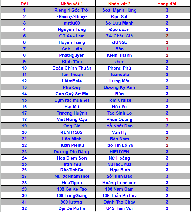Cách để chia hạng đội được tính như sau : Cãi lão, cấp độ, Trang bị ( vô danh), ngựa ( tính tổng số sao của đội), phi phong, trang sức, số lượng trấn phái linh dược đã sử dụng.