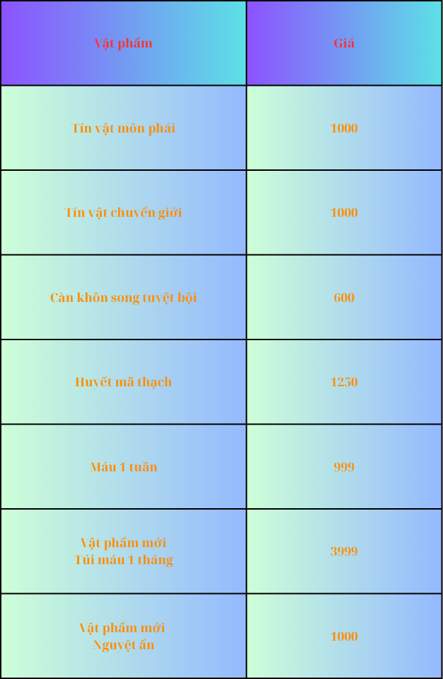 Điều chỉnh giá 1 số vật phẩm để phù hợp hơn với server, mở bán thêm các vật phẩm khác như túi máu 1 tháng, nguyệt ẩn.