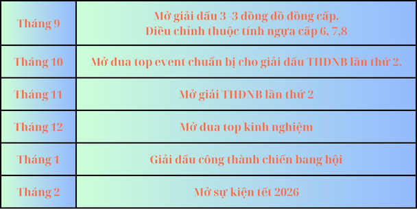 Đã lâu mình k làm kế hoạch cho server. Và đây là kế hoạch cho 6 tháng tiếp theo để anh em tiện theo dõi, đây là các sự kiện tính năng lớn ingame. Có thể có chút điều chỉnh tủy thuộc vào server. Những hoạt động nhỏ vẫn sẽ được điều chỉnh để phù hợp với server hơn.