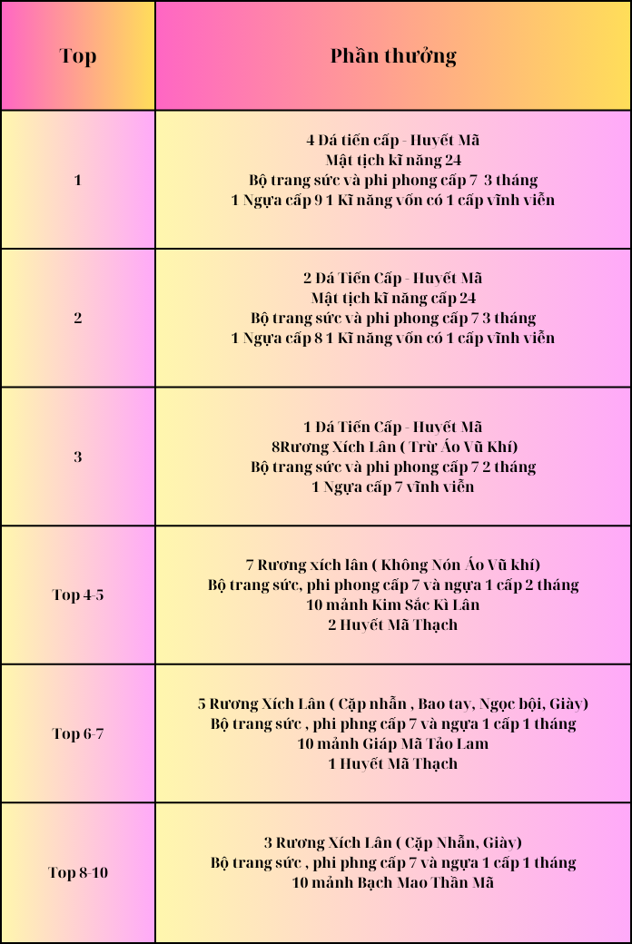Phần thưởng sẽ được trao sau 1 -2 ngày kết thúc top.