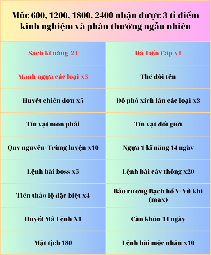 Khi đạt mốc Bí Kíp Võ Công Thượng Thừa 600, 1200, 1800 và 2400 sẽ được nhận thêm kinh nghiệm và nhiều phần thưởng hấp dẫn
