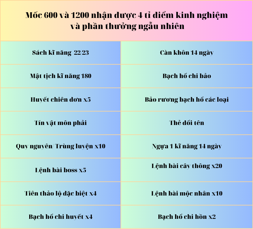 Khi đạt mốc 600 và 1200 sẽ được nhận thêm kinh nghiệm và nhiều phần thưởng hấp dẫn
