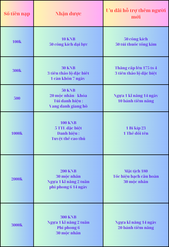 Hỗ trợ mới bao gồm acc chính : Set bạch hổ, bí kíp 23, vòng triệu mãnh, cấp 170 trùng sinh 4, ngựa 1 cấp 7 ngày, vòng vang danh 14 ngày, phi phong 6 14 ngày, càn khôn 1 tháng 20 kv + 1kx