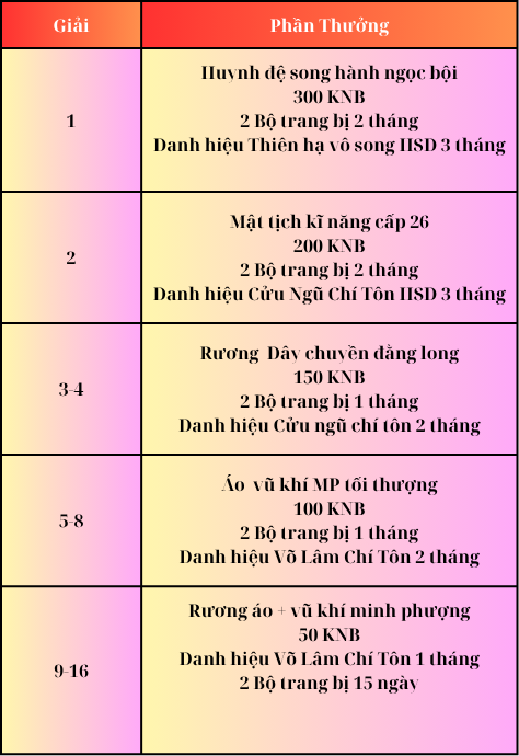 Chúc mừng nhà vô địch của giải đấu lần này : Team Phúc Quang và  Việt Cứng Cặt với phần thưởng cực kì có giá trị. Và cũng chúc mừng 15 team còn lại đã xuất sắc vượt qua các đối thủ khác để đạt phần thưởng có giá trị khác.