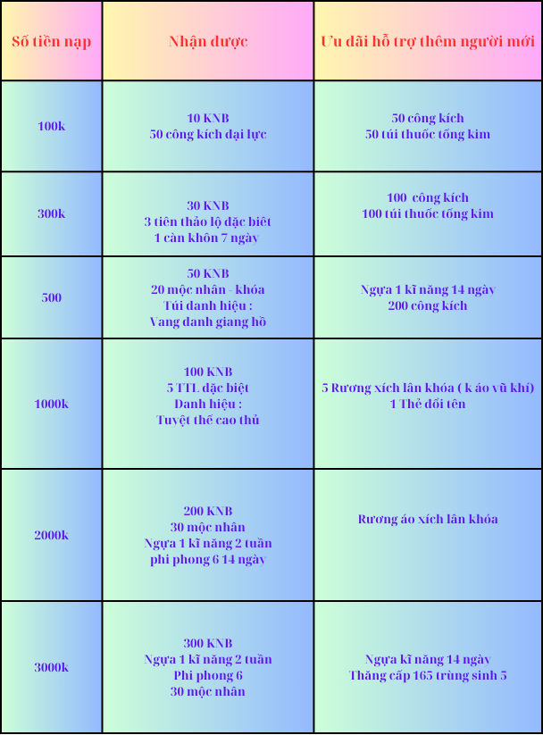Hỗ trợ mới người chơi mới : Hỗ trợ acc chính lên 155 trùng sinh 5 ( Acc chính trong server nếu chưa đạt 155 sẽ hỗ trợ lên 155)3 món xích lân, set bạch hổ max ( Nhẫn thượng, hạ, bao tay, Bí kíp 23, vòng triệu mãnh, vang danh, ngựa 14 ngày. Acc xe 190 Bí kíp 23, set bạch hổ max 14 ngày, vòng triệu mãnh, vang danh, ngựa 14 ngày.
