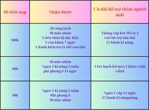 Người mới chỉ cần nạp đủ 600k là có thể có account bằng account trong server và tham gia với độ ổn định cao. Ban quản trị game cam kết sẽ cố gắng nỗ lực hết mình để server phát triển ngày càng đông, vui hơn.