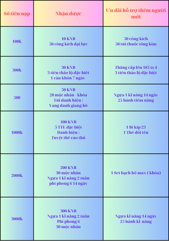 Tân thủ mới sẽ được cấp 180 trùng sinh 4 acc chính, full set bạch hổ, bí kíp 23, 180. Ngựa 1 cấp 7 ngày, phi phong 6, ấn, mặt nạ, càn khôn 14 ngày. ( 90% trong server) vòng triệu mãnh, vang danh 10kv, 1000 xu để trải nghiệm game.