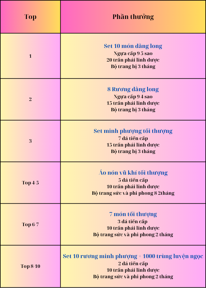 Thời gian tham gia sự kiện : Từ 2/1  khi anh em sử dụng bánh chưng thượng hạng sẽ được tính số lượng đua top. Sẽ chốt top vào 24h ngày 15/1/2025. Top 10 người sử dụng bánh chưng thượng hạng nhiều nhất sẽ được những phần thưởng cực kì giá trị