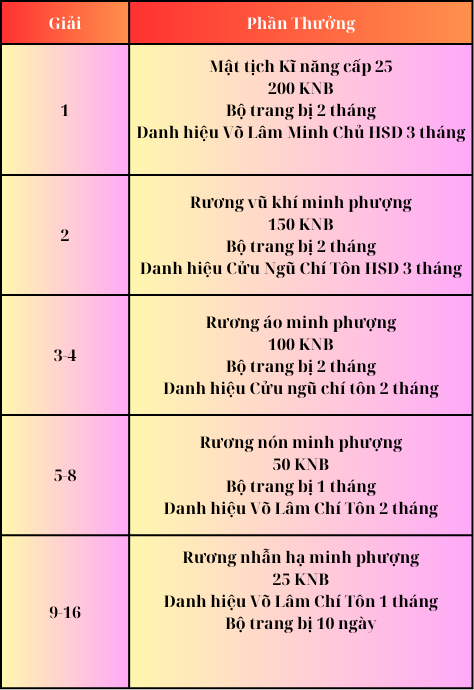 Tất cả anh em tham gia giải đáu võ lâm minh chủ đều có giải thưởng.